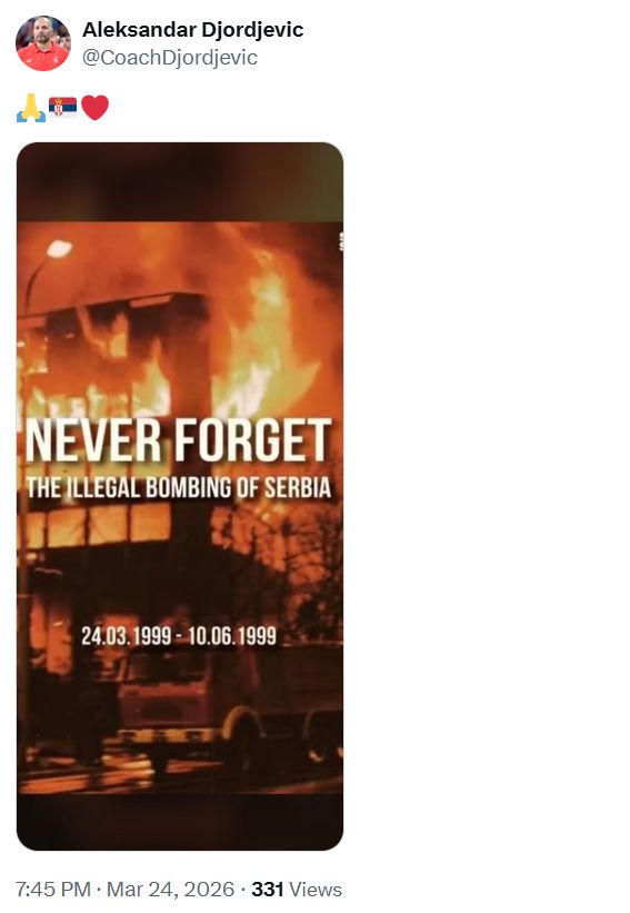 Aleksandar Saša Đorđević, nekadašnji reprezentativac Jugoslavije i poznati košarkaški trener, oglasio se na društvenim mrežama povodom godišnjice početka bombardovanja Savezne Republike Jugoslavije. Đorđević je 24. marta, na dan kada je pre 25 godina započeta NATO intervencija, podelio fotografiju zgrade u plamenu iz perioda bombardovanja, uz natpis: ‘Da se ne zaboravi, 24. 3. 1999 – 10. 6. 1999’.